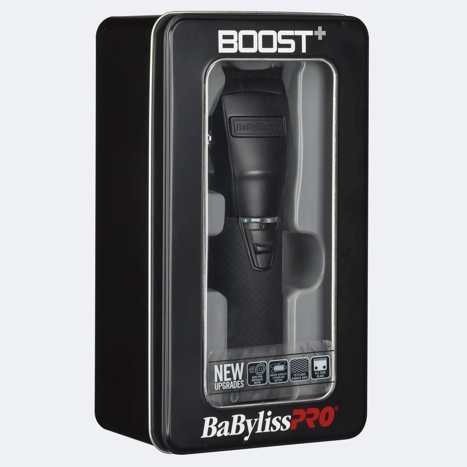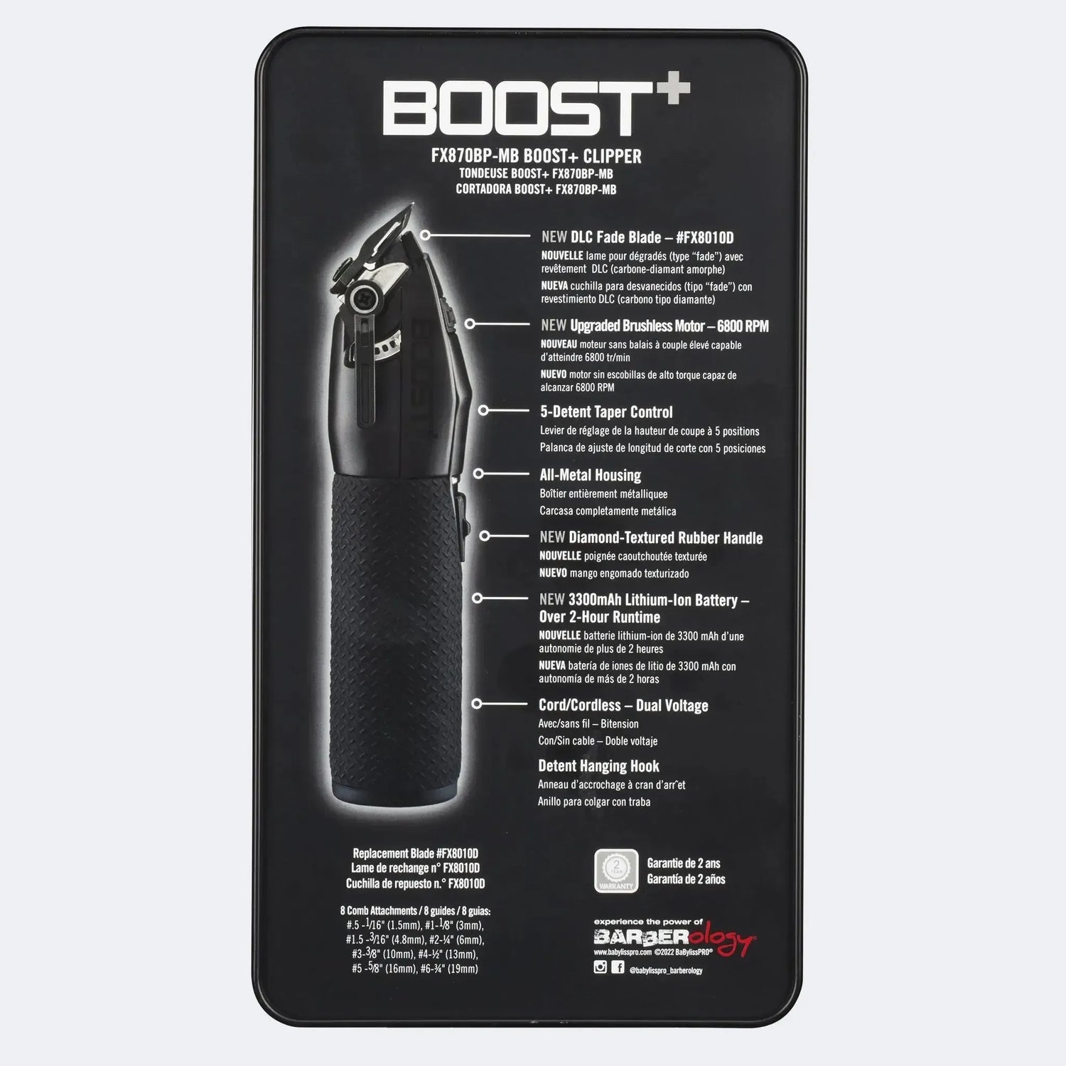 The BaBylissPRO Matte BlackFX Boost+ Clipper is a cord/cordless clipper equipped with a high-torque, brushless motor. It is the perfect tool for cutting with power, speed and precision on all hair types. Features an all-metal housing with diamond-textured rubber grip and a high capacity Lithium Ion Battery with a 2-hour run time. Comes with 5-detent taper control, dual voltage capabilities, a detent handing hook and comes with 8 comb attachments. (model # FX870BP-MB)