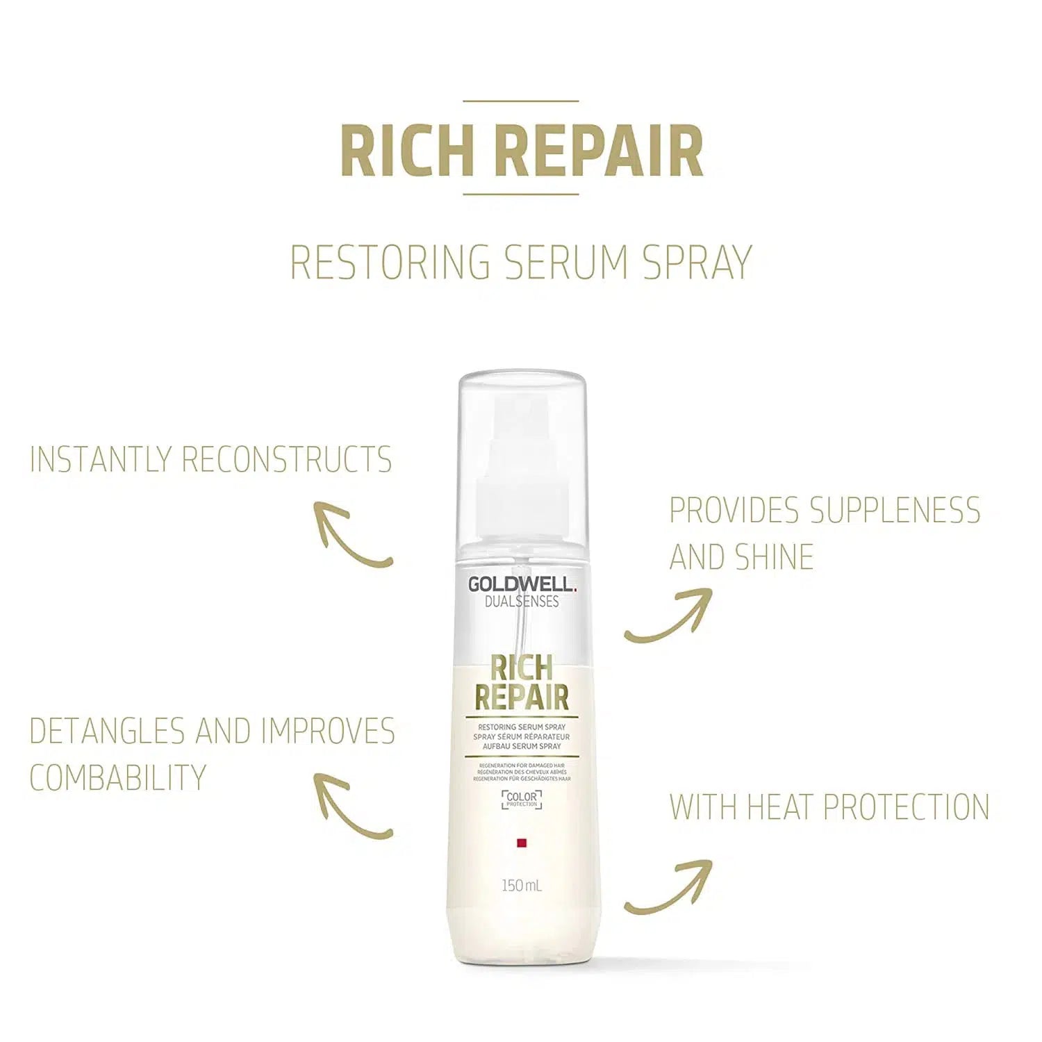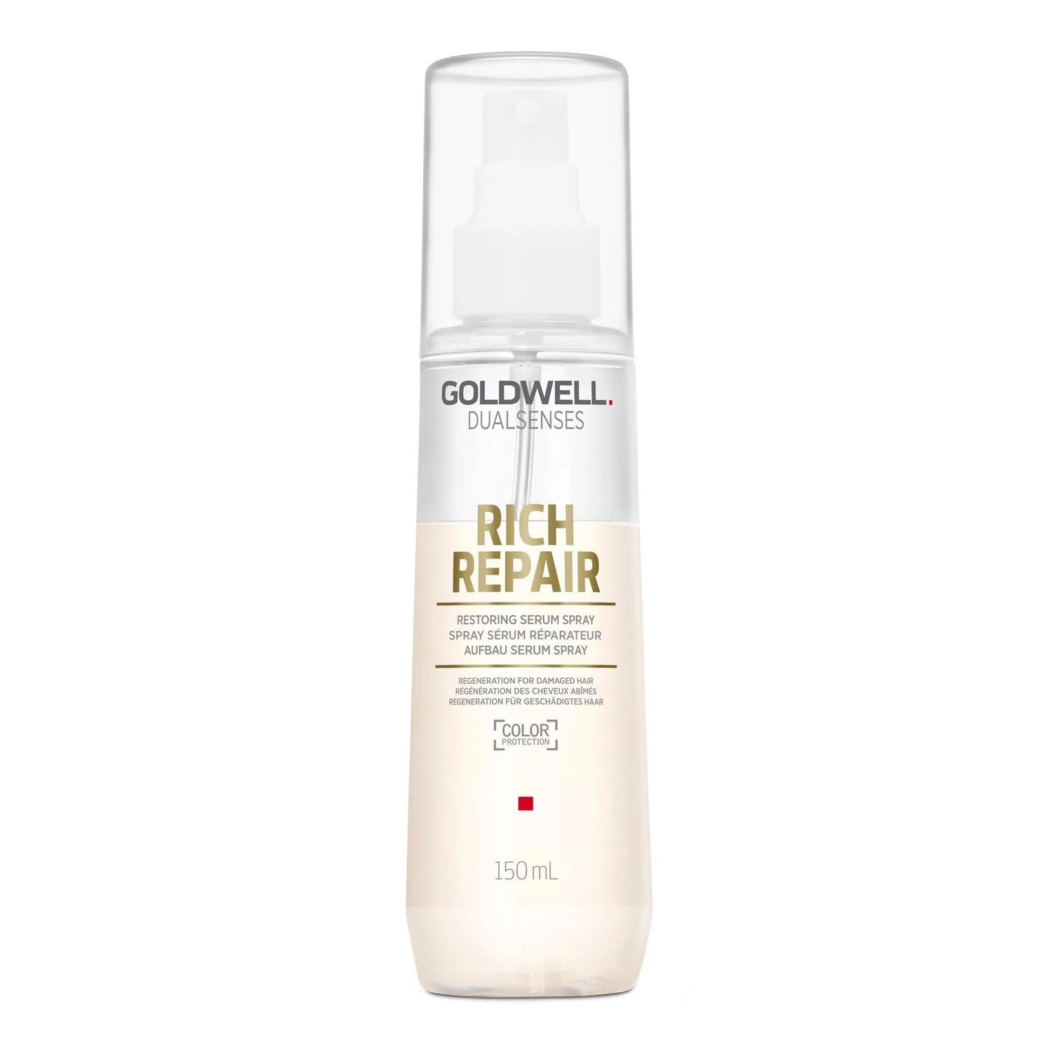 Goldwell Dualsenses Rich Repair Restoring Serum Spray instantly reconstructs hair while enhancing suppleness and shine. This easy-to-use spray delivers powerful Lipids that target damaged hair and intensively repair and regenerate the inner structure for more healthy hair from the inside out. In addition to treating and restoring hair, this serum will also detangle and improve manageability for all-around healthier and more radiant hair. Developed with an innovative microPROtec complex to evenly and quickly distribute essential care ingredients, you will get instant results that you can both see and feel.