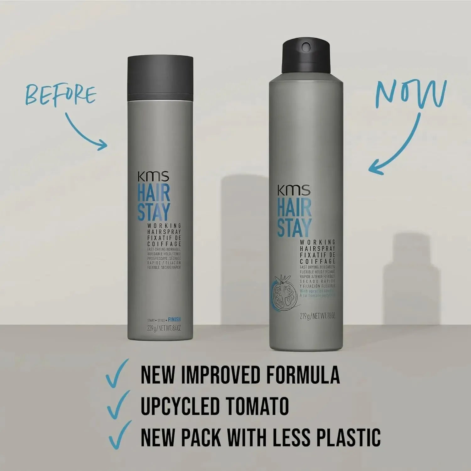 The KMS Hairstay Working Hairspray is a professional styling solution that allows you to shape, respray, and restyle hair without stiffness. Its dry, soft-moldable formula delivers medium hold that intensifies with use while providing heat protection and frizz control. Ideal for maintaining sharp, smooth, and manageable styles, it keeps hair polished and ready for any occasion.