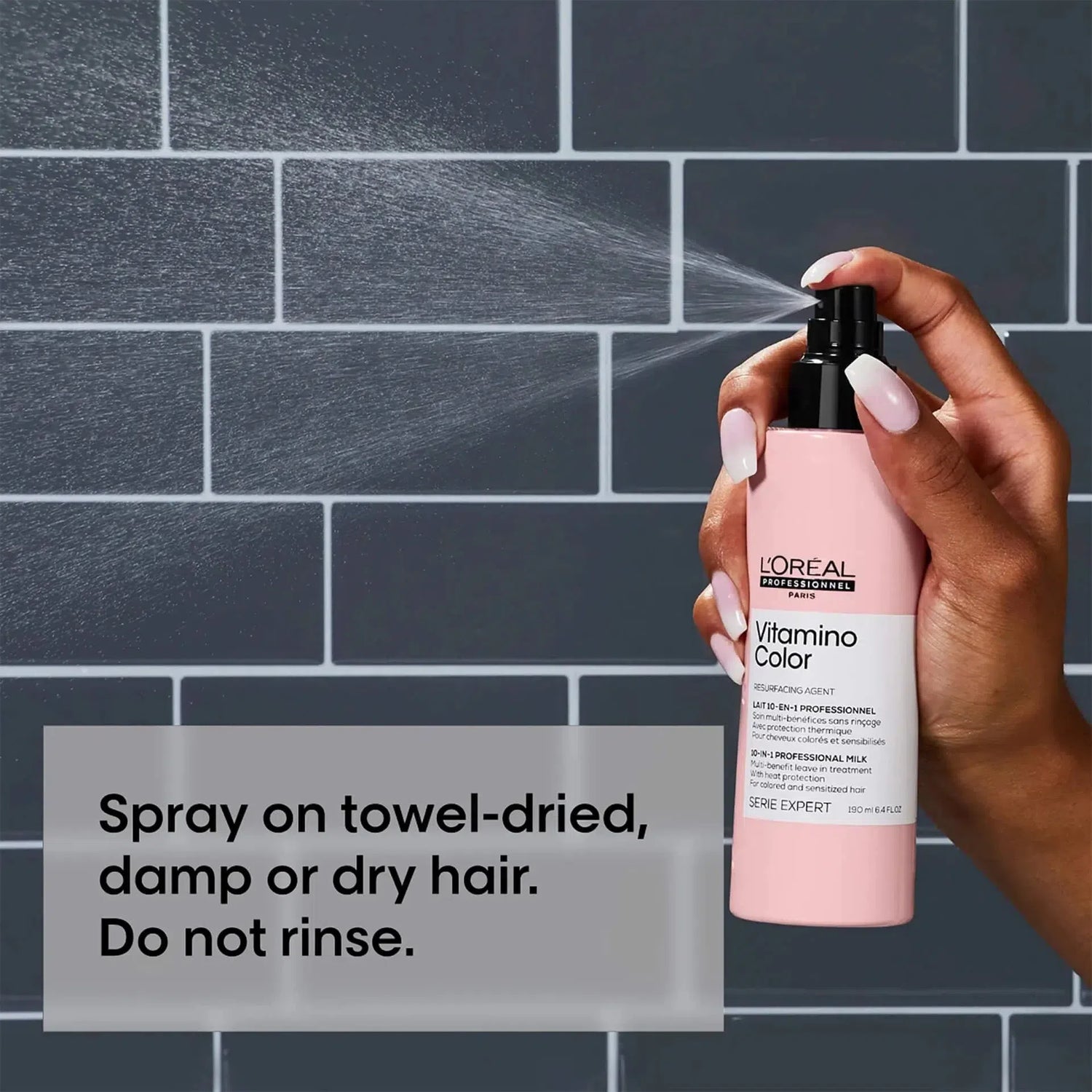 L’Oréal Professionnel Serie Expert Vitamino Color 10-in-1 Multipurpose Perfecting Spray delivers 10 healthy hair benefits in one easy-to-use product. Designed to protect against heat up to 450°F (230°C), nourish, resurface damaged hair, reduce split ends, detangle, decrease blow drying time, hydrate, prevent breakage, decrease split end formation, and reduce frizz, your hair will thank you with each use. This colour-safe, non-greasy and lightweight spray will become an instant favorite in your daily haircare routine.
